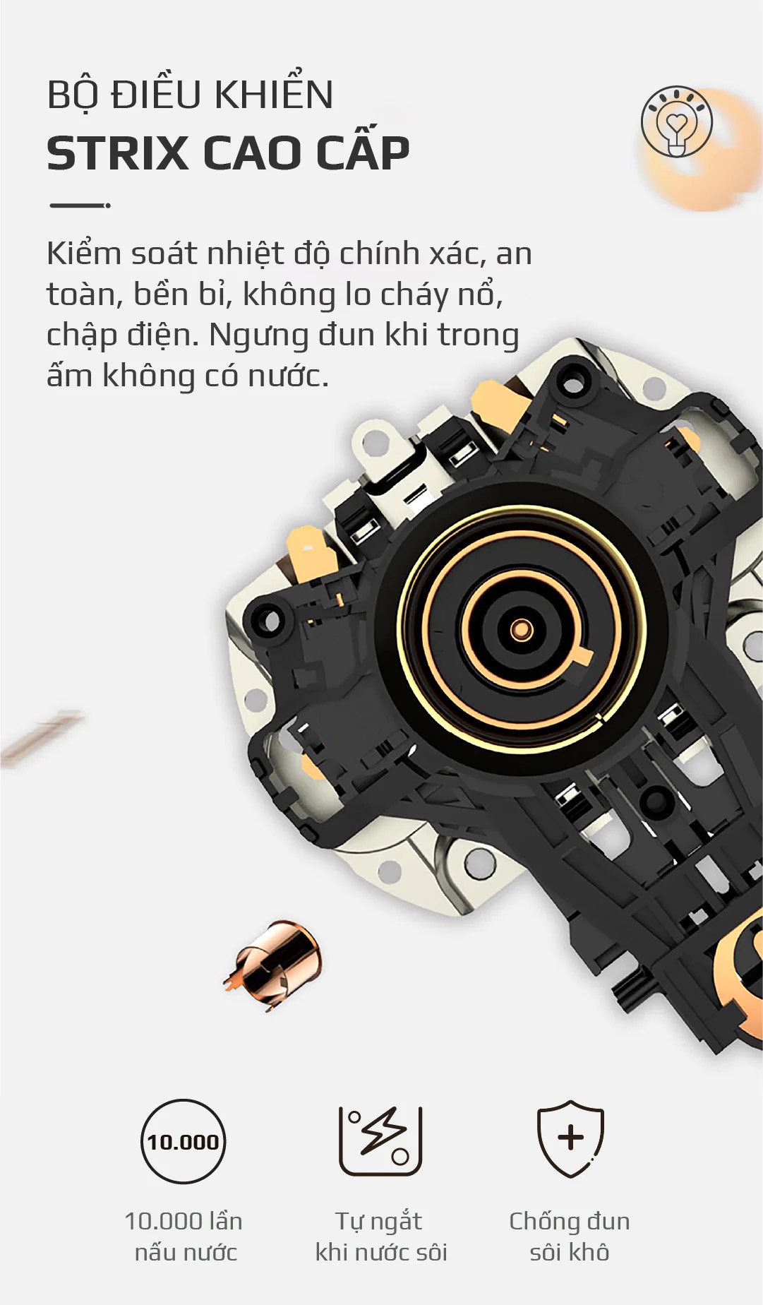 Ấm siêu tốc OLIVO EK207 được tích hợp bộ điều khiển STRIX cao cấp, đây là công nghệ hiện đại nhất được ứng dụng vào dòng ấm đun nước siêu tốc hiện nay. Với bộ điều khiển này người dùng dễ dàng kiểm soát nhiệt độ một cách chính xác, tự ngắt điện khi nhiệt độ vượt quá ngưỡng cho phép, đồng thời chống chập điện, cháy nổ và nâng cao tuổi thọ của ấm.