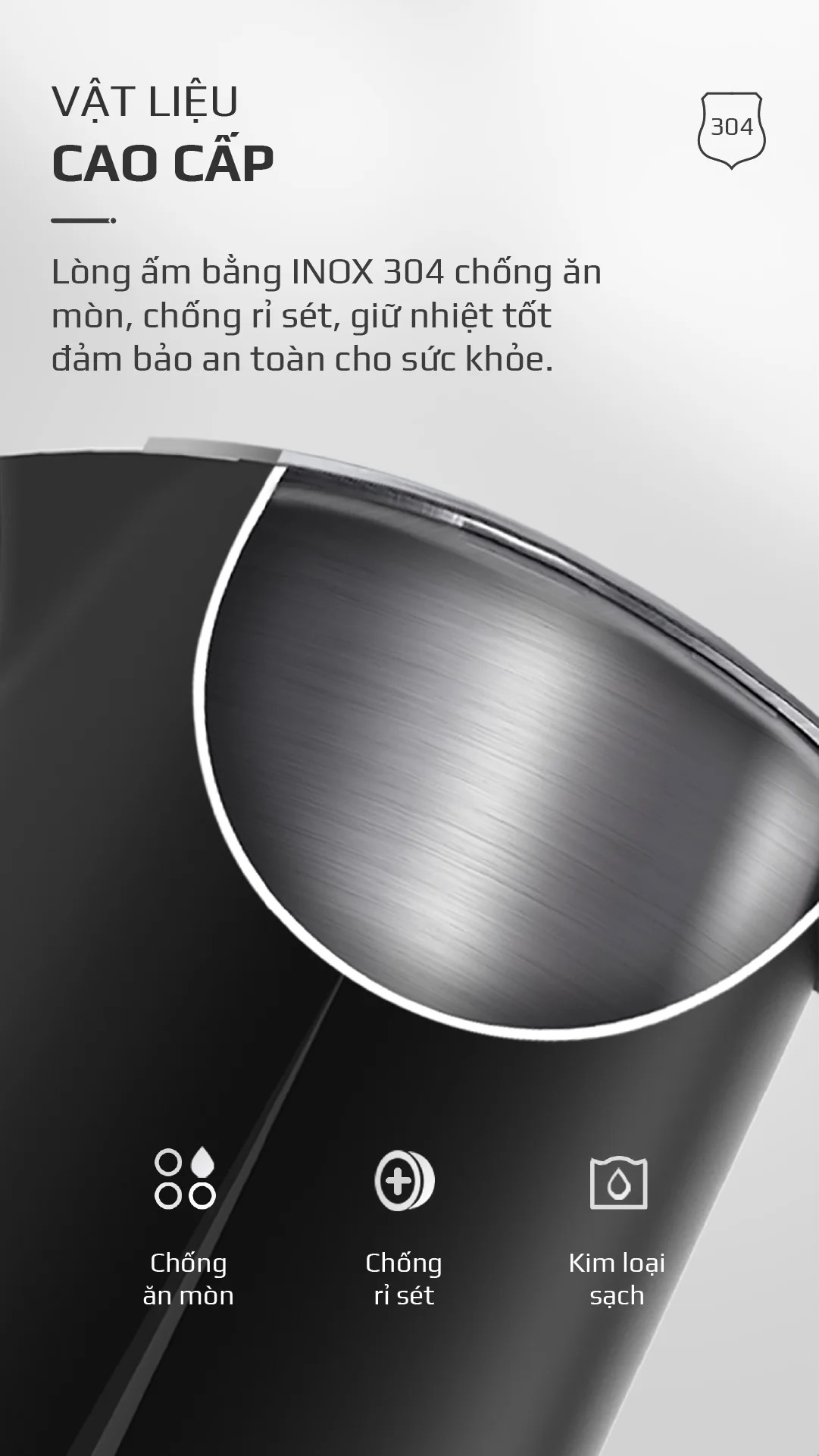 Lòng ấm INOX 304 cao cấp chống ăn mòn, chống gỉ sét, giữ nhiệt tốt và an toàn cho sức khỏe người dùng nên người dùng có thể hoàn toàn yên tâm sử dụng hằng ngày. Chất liệu này cũng dễ dàng vệ sinh và làm sạch, đảm bảo lòng ấm luôn sạch bong và sáng bóng.