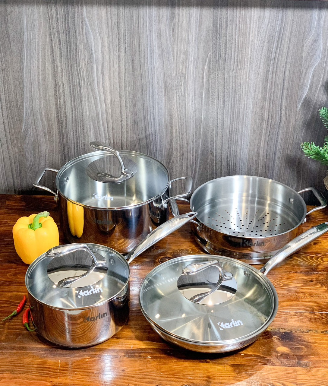- Lớp ngoài phần thân làm từ inox 304 được đánh sáng bóng để tăng độ thẩm mỹ; lớp ngoài phần đáy được tích hợp thêm từ tính để bếp nấu được trên mọi loại bếp: bếp từ, bếp điện, bếp gas, bếp hồng ngoại
