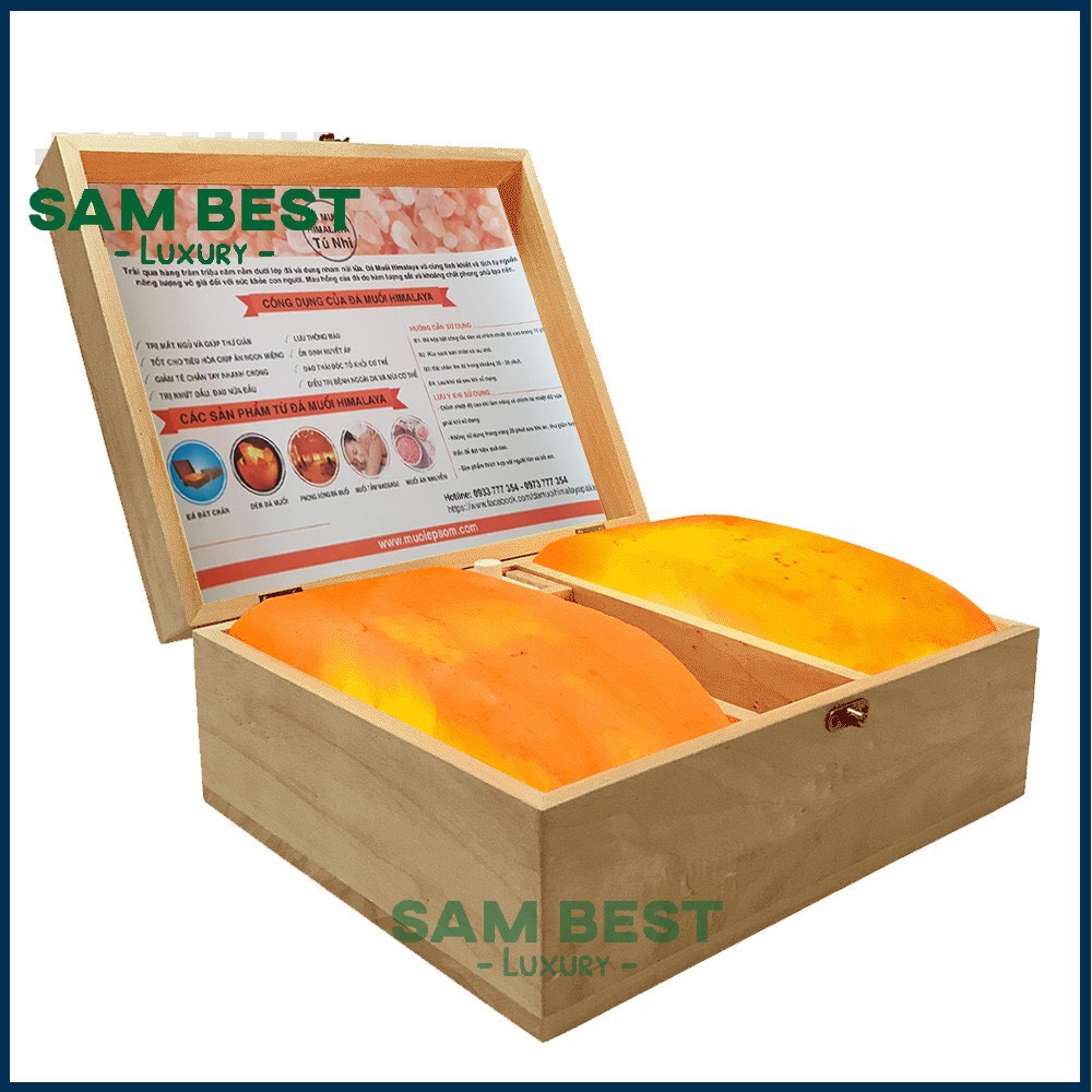 - Bộ sản phẩm gồm: 1 hộp đèn đá muối + 2 viên đá muối mặt cong massage chân