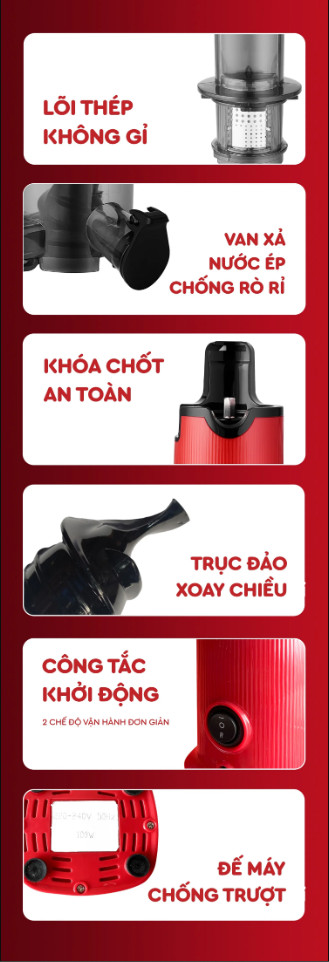 - Giữ lại lượng vitamin trong hoa quả cao gấp 6 lần, lượng nước ép tăng gấp đôi và lượng bã chỉ bằng 1/3 so với các máy ép thông thường, nước ép cũng không bị tách nước và không tạo bọt