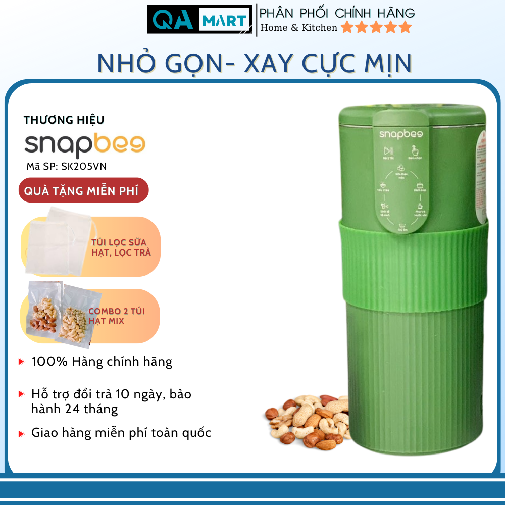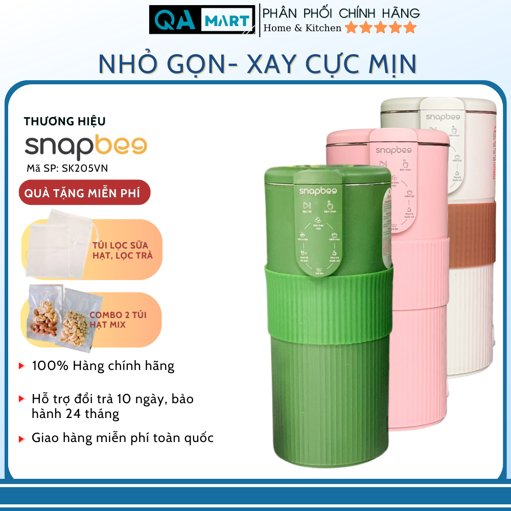 Sản phẩm máy làm sữa hạt mini Snapbee SK205VN được gia công, nhập khẩu chính ngạch và đã được kiểm nghiệm đạt chứng nhận uy tín của VIETCERT (Trung tâm Giám định và Chứng nhận hợp chuẩn hợp quy Việt Nam) trước khi lưu thông trên thị trường