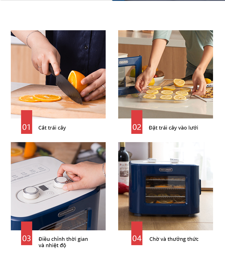 Máy sấy thực phẩm Morphy Richards là một thương hiệu nổi tiếng từ Anh Quốc. Dòng sản phẩm được thiết kế dùng trong gia đình, vận hành êm ái, chất lượng sấy tuyệt vời. Ngoại hình được thiết kế theo phong cách hiện đại pha chút cổ điển rất phù hợp cho căn bếp xinh xắn của bạn.