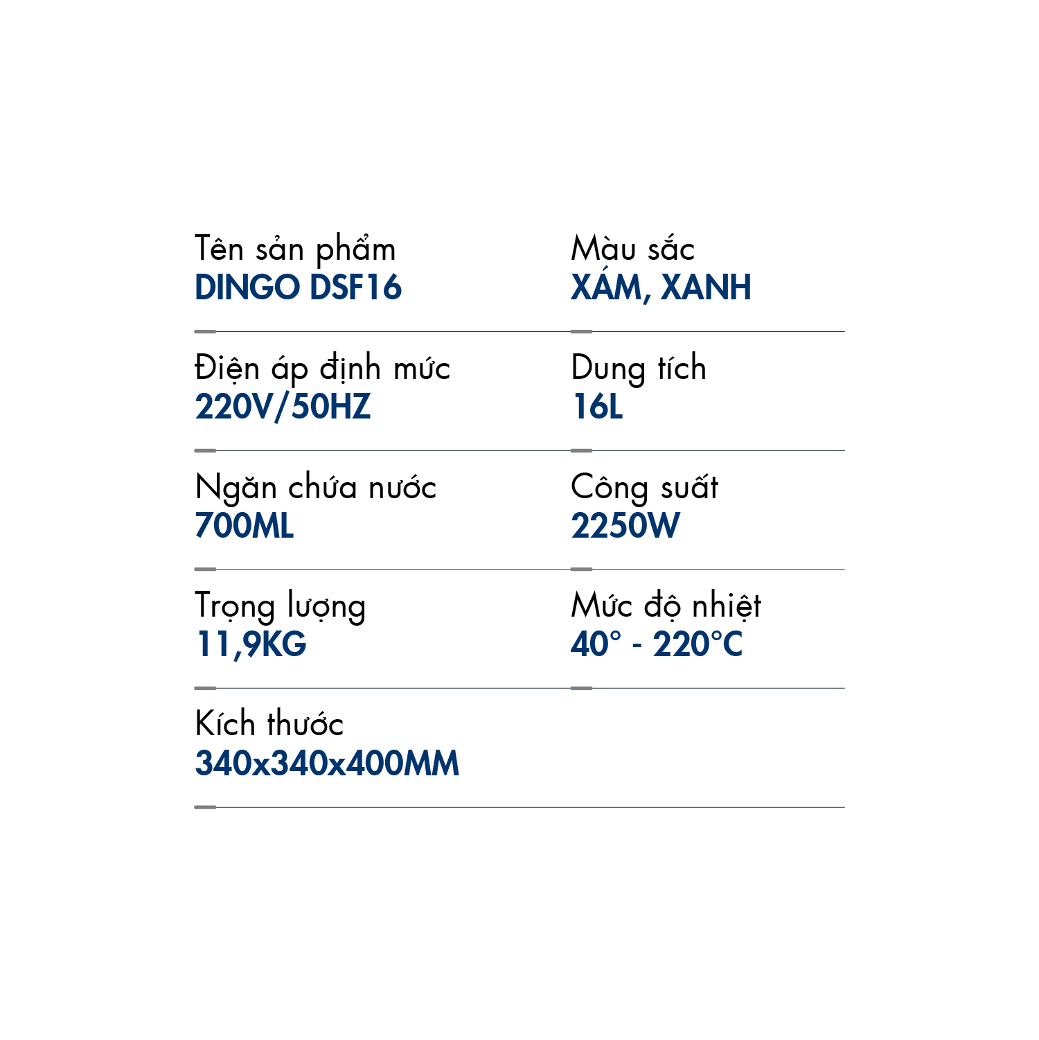 - DINGO DSF16 mang lại sự lựa chọn đa dạng có thể chế biến được toàn bộ các món ăn ngon với nhiều giá trị dinh dưỡng khi có giải nhiệt độ nấu rộng từ 30 độ C tới 220 độ C.