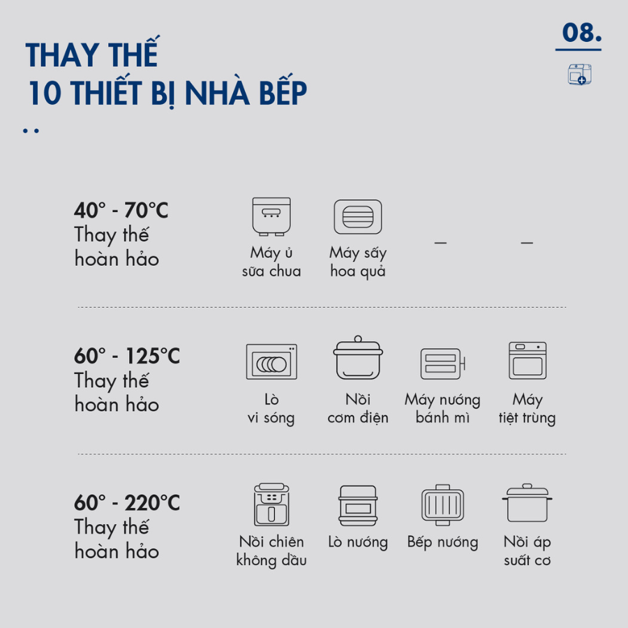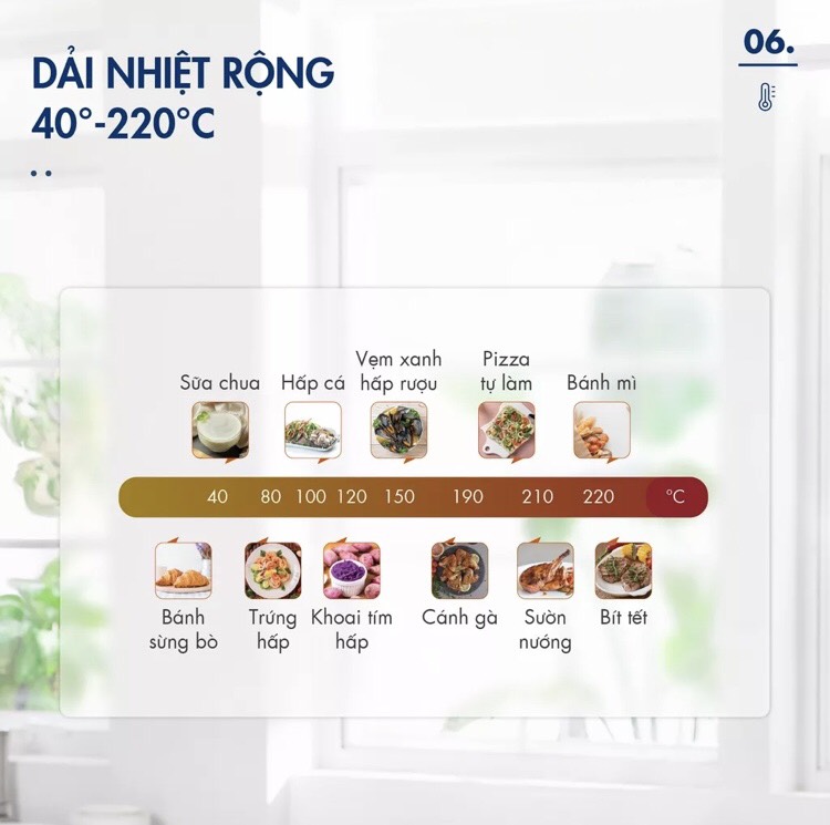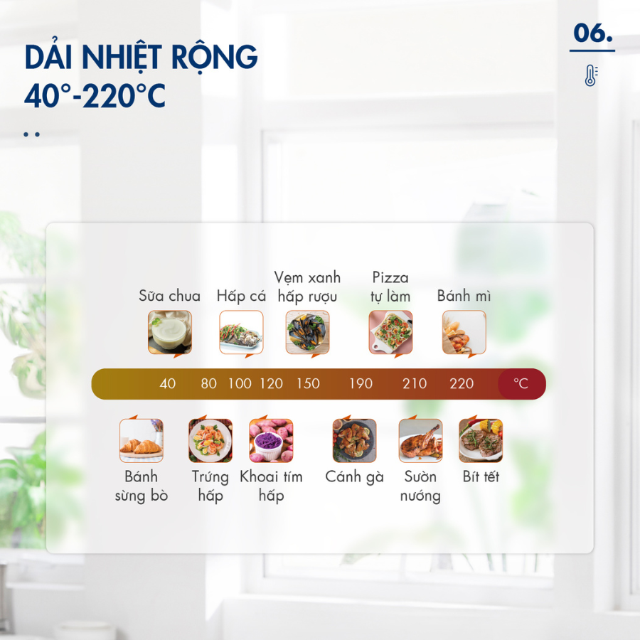 - Với mức nhiệt rộng mỗi loại thực phẩm sẽ có dải nhiệt phù hợp riêng giúp thực phẩm chín đủ độ đồng thời giữ được trọn vẹn hương vị tự nhiên, cùng với dinh dưỡng vốn có của mình.