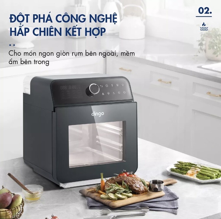 - DINGO mang lại sự đột phá về công nghệ hết sức độc đáo khi kết hợp được tính năng hấp và chiên không dầu trong cùng 1 chương trình với tên gọi “Chiên hơi nước”. Cơ chế vừa hấp vừa chiên tuần hoàn giúp món ăn chín mềm bên trong, vỏ ngoài giòn rụm chắc chắn sẽ làm hài lòng cả những khách hàng khó tính nhất.