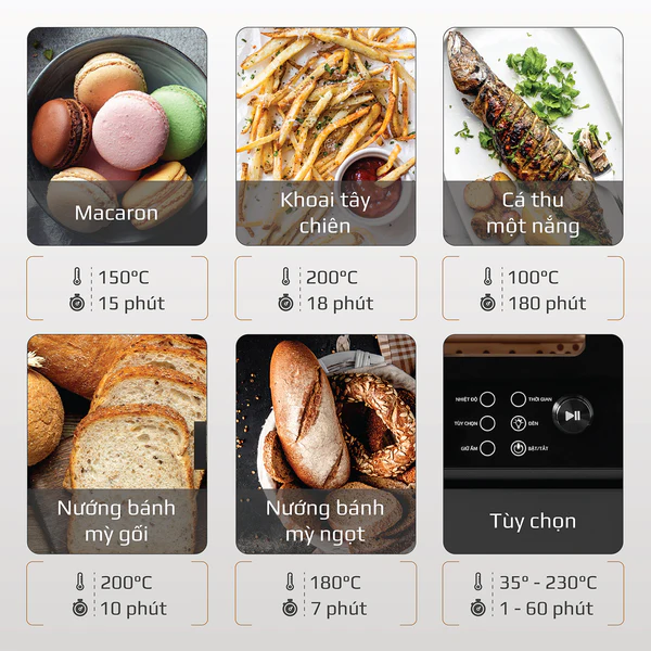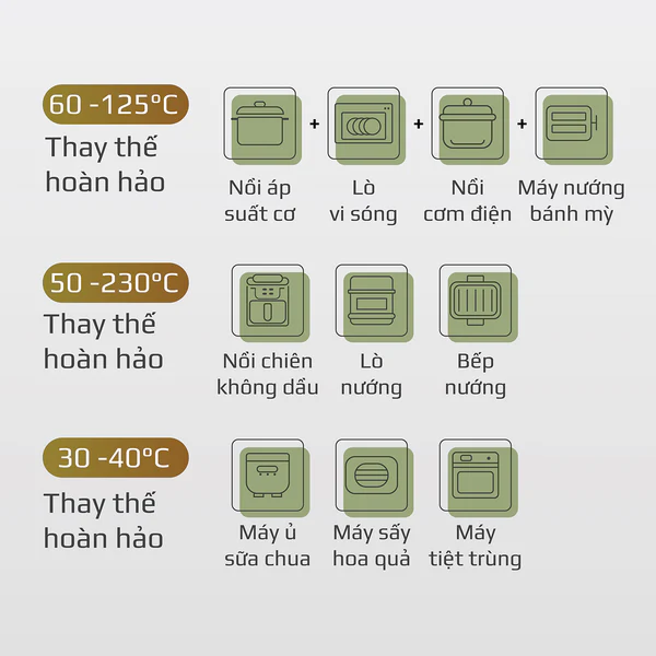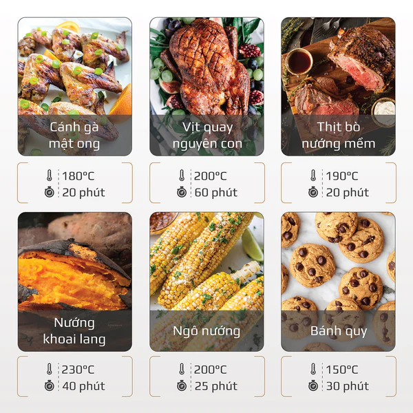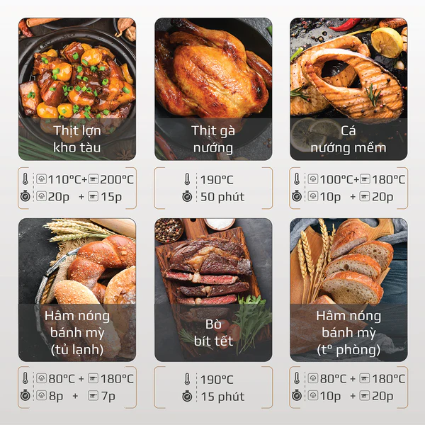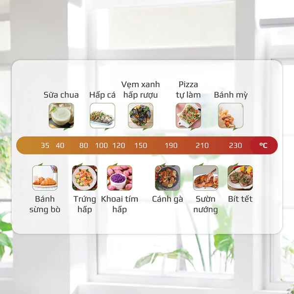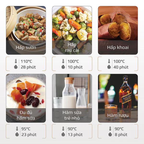 - Với mức nhiệt rộng mỗi loại thực phẩm sẽ có dải nhiệt phù hợp riêng giúp thực phẩm chín đủ độ đồng thời giữ được trọn vẹn hương vị tự nhiên, cùng với dinh dưỡng vốn có của mình.