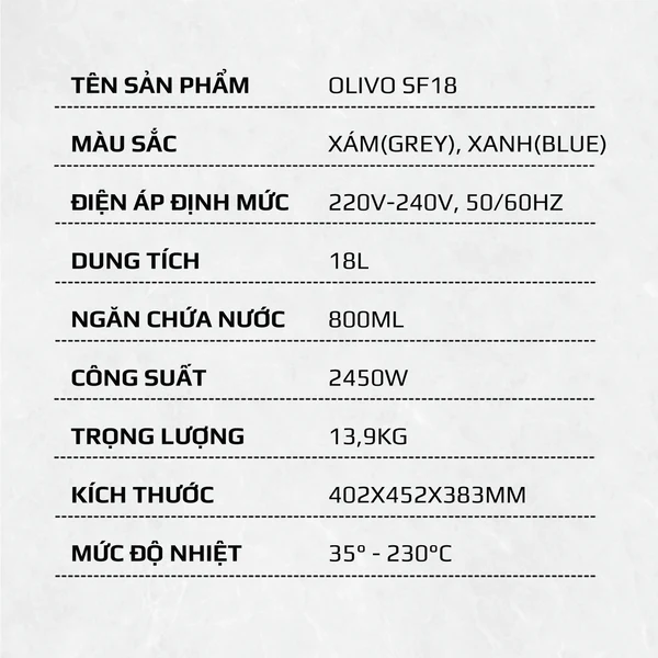 - Cùng tìm hiểu những ưu điểm nổi bật và những tính năng cao cấp nhất của OLIVO SF18, hi vọng trong thời gian sắp tới đây sẽ là sản phẩm được Chị em nội trợ Việt săn đón và là trợ thủ đắc lực nhất trong mọi căn bếp của mỗi gia đình.