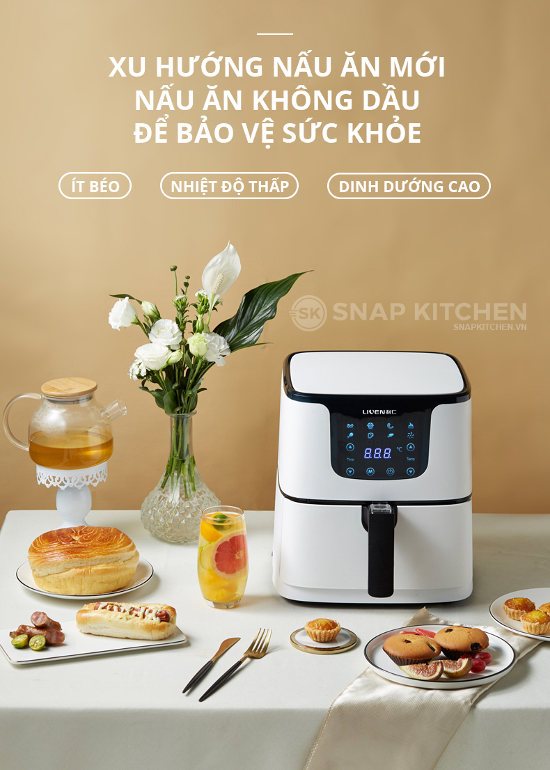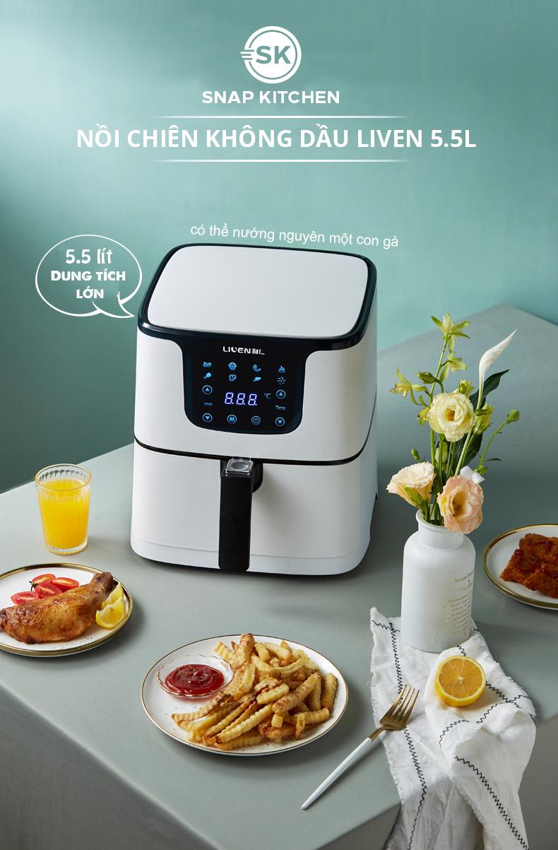 Nồi chiên không dầu Liven 5.5 lít là sản phẩm do chính Snap Kitchen phân phối và bảo hành chính hãng tại Việt Nam. Sản phẩm được sản xuất trên dây chuyền hiện đại, an toàn và bền bỉ. Giờ đây việc nấu nướng của chị em nội trợ chúng ta trở nên dễ dàng hơn với sản phẩm này. Loại bỏ lượng lớn dầu mỡ dư thừa trong thực phẩm giúp bảo vệ sức khỏe của gia đình bạn.