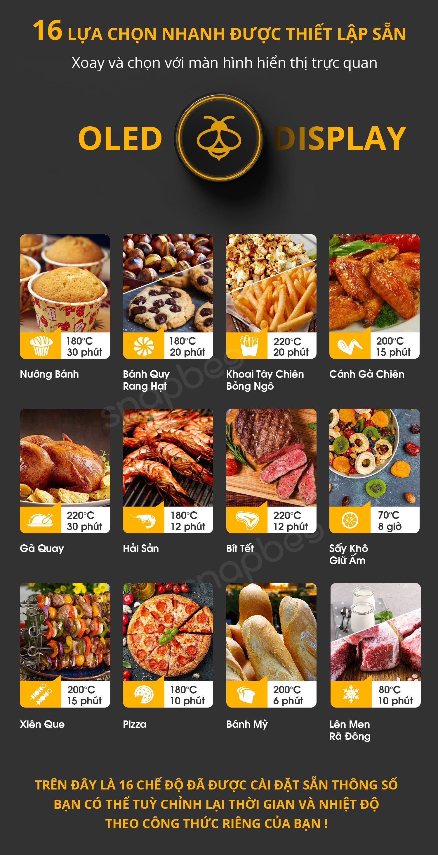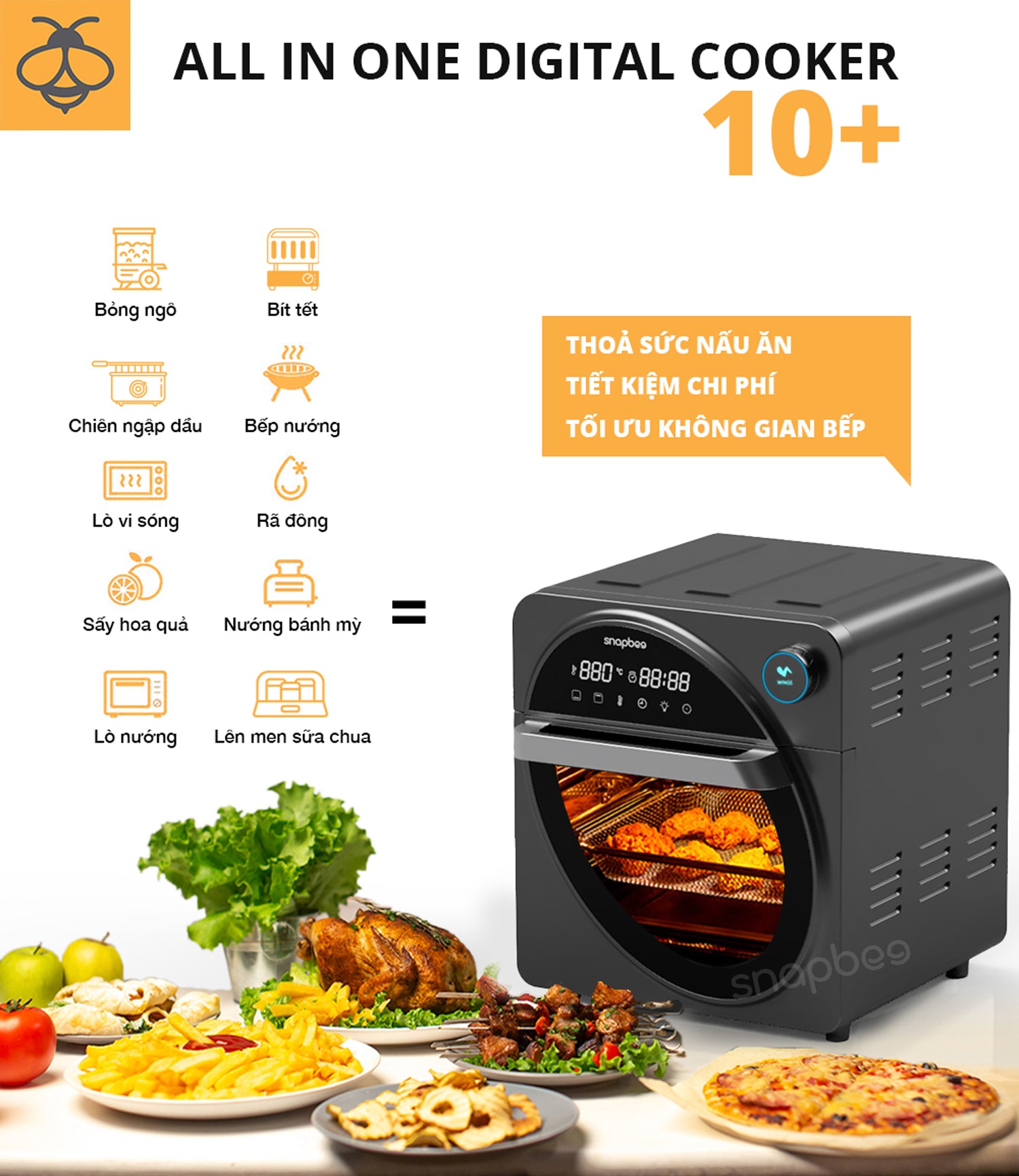 - SNAPBEE QUEEN RF15 có thể được sử dụng thay thế các thiết bị nhà bếp khác như: lò nướng, lò vi sóng, bếp nướng, máy sấy hoa quả, máy nướng bánh mì, máy làm bỏng ngô và máy làm sữa chua, nồi chiên sâu, máy làm bít tết, rã đông.