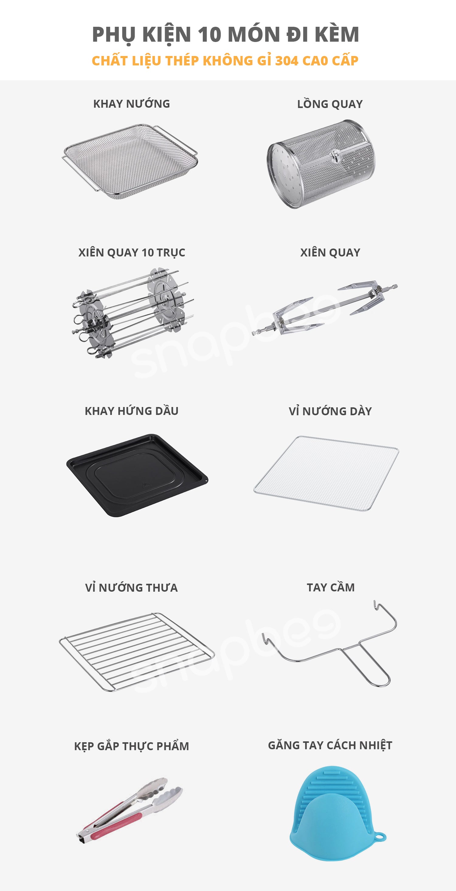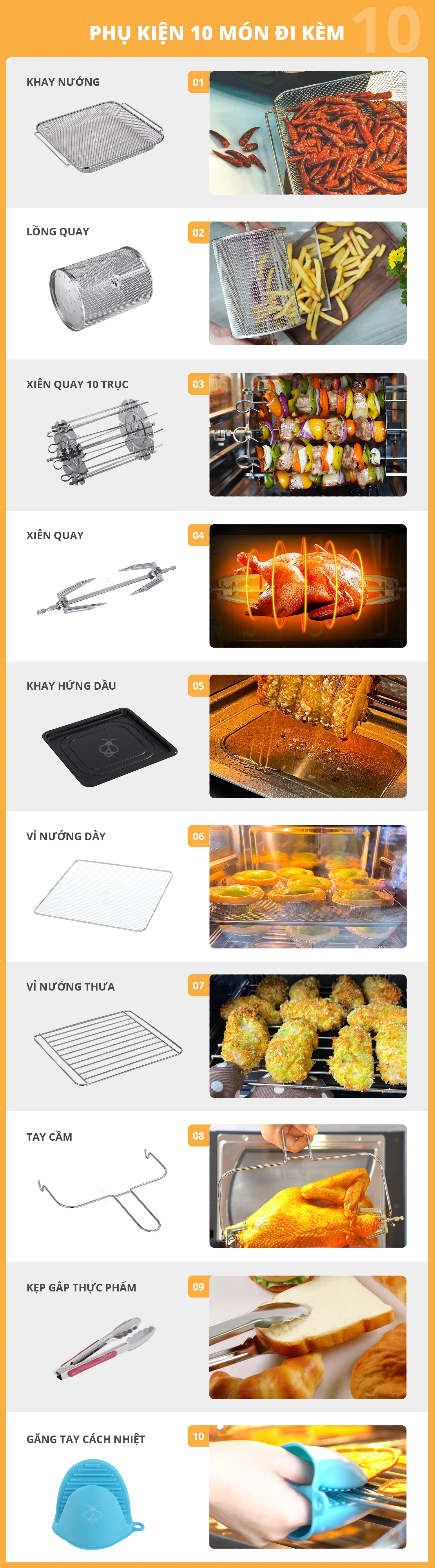 - Và quà tặng khủng kèm theo: Combo lồng quay và Xiên que 10 trục, Kẹp gắp thực phẩm, Găng tay cách nhiệt, Sách công thức nấu ăn với hơn 30 công thức Âu - Việt đang dạng.