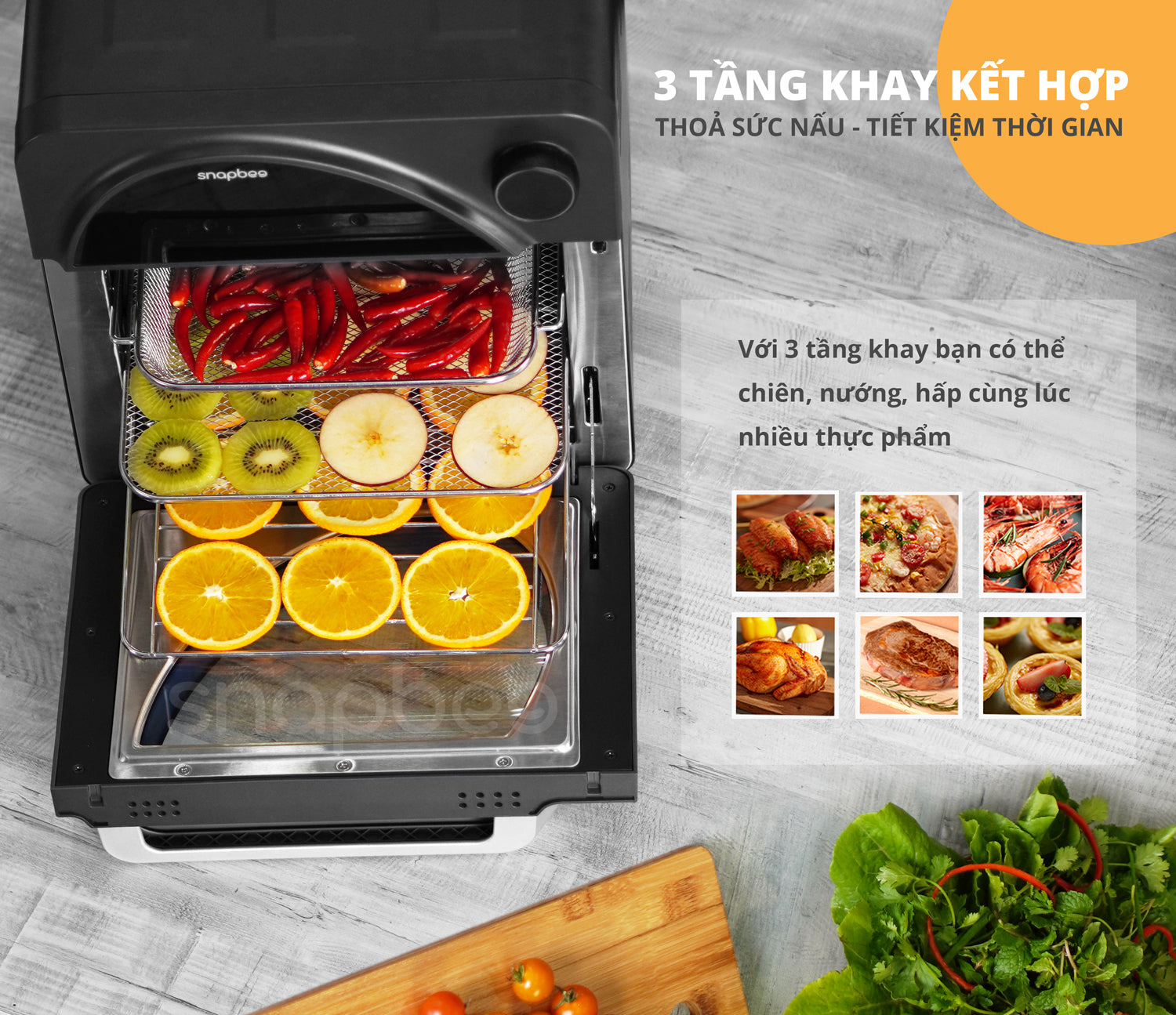 Dễ dàng chủ động trong việc dùng gia nhiệt trên, gia nhiệt dưới hoặc gia nhiệt kép. Giúp đồ ăn chín đều không cần lật dở. Cùng với thiết kế có thể chế biến cùng lúc 3 món ăn với 3 tầng nướng riêng biệt. Đây là một trong những tính năng vượt trội của SNAPBEE QUEEN RF15 so với các nồi chiên không dầu bình thường, nỗi lo thức ăn không chín đều đã được giải quyết. Giúp cho người sử dụng SNAPBEE QUEEN RF15 không cần phải mở nồi để đảo mặt thực phẩm, vừa giúp an toàn tuyệt đối cũng như tiết kiệm thời gian công sức khi nấu nướng.