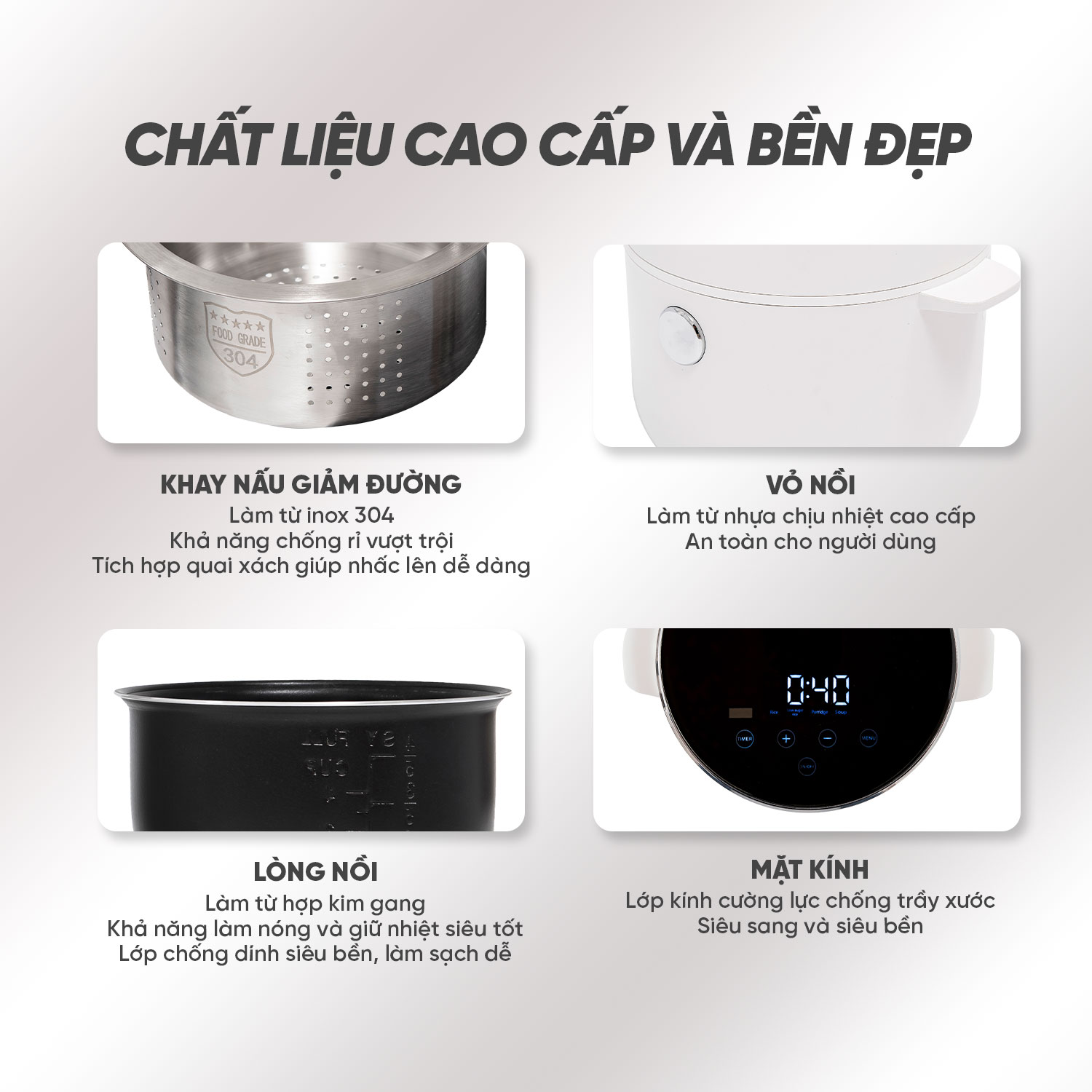 - Nồi cơm đa năng nấu cơm giảm đường, nấu cơm thường, nấu cháo, luộc rau củ…