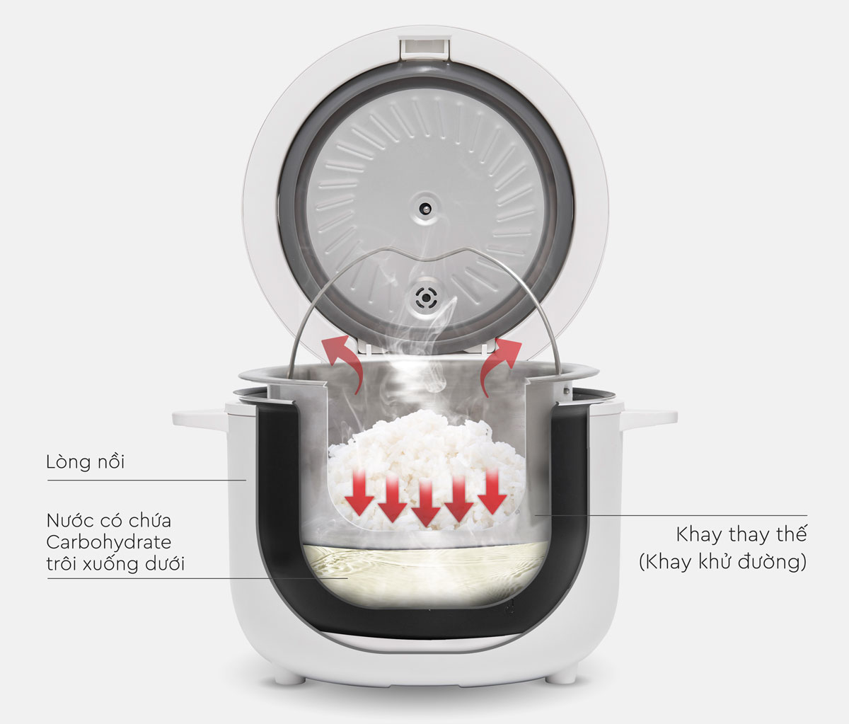 Khi nấu cơm ở chế độ giảm đường (tức Low Sugar Rice), trong suốt quá trình dẻo hóa của hạt gạo, công nghệ tiên tiến của nồi sẽ làm cho các phân tử carb bị phân tách. Đồng thời, đẩy carb nhanh ra khỏi hạt gạo, hòa tan chúng vào nước và lọc thẳng xuống đáy nồi phía dưới. Phần cơm đã giảm đường sẽ nằm trọn ở khay phía trên và tiếp tục được làm chín.